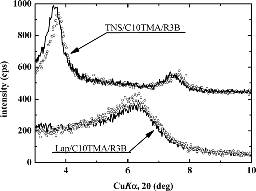 図2に乾燥状態と水分子を飽和吸着させた試料の発光スペクトルを示す。Lap系では大きな発光変化は観測されなかったものの,TNS系では発光ピークのブルーシフトが観測された。この結果は,XRDの場合と同様にハイブリッド中への水の吸着量の違いにより引き起こされたものである。水分子を飽和吸着させたTNS系で観測された発光スペクトルのピーク波長が水溶液中でのR3B陽イオン由来の発光ピーク波長とほぼ一致したことから,水の吸着が起こることにより層間のR3B陽イオンは水溶液中と同様に大きな束縛を受けない状況にあると考えられる。このことは,少なくともTNS 系が有する水吸着サイトの一つはTNS層表面であり,ここへ水が吸着することにより層間のR3Bと層表面に存在するイオン交換サイト間の静電相互作用が弱まったことが示唆される。