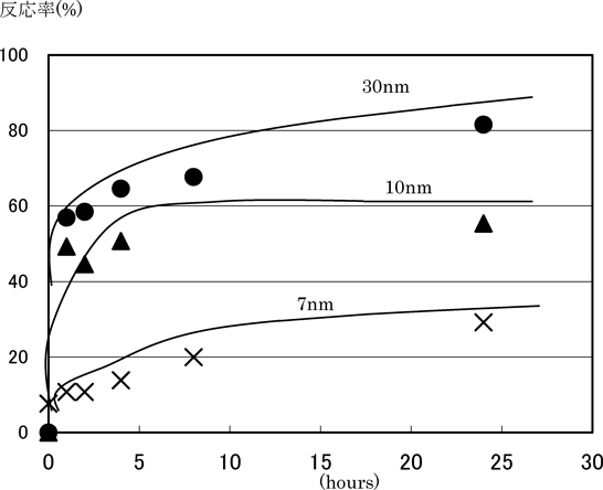 表7に各条件と24時間後の反応率を示した。また図21及び22に各パラジウム添加量別に細孔径と反応率を時間ごとに示した。反応率はパラジウム量よりもベースとなるシリカの細孔径に依存した。細孔径30 nmのシリカゲルが良好な活性を示し,反応生成における立体効果が考えられる。またリサイクル試験F〜Hに示されるように触媒の繰り返し使用でも高収率での反応が可能であった。