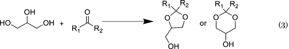 グリセロールの誘導体化法として,酸触媒を用いグリセロールのヒドロキシル基をケトンやアルデヒドと反応させアセタール化する手法がある(Eq. 3)12)。アセタール化することで,3つの水酸基のうち2つのヒドロキシル基を保護し,さらに残り1つのヒドロキシル基を選択的に反応させることが可能になる。また,有機溶媒への溶解性が向上しグリセロールに比べて非常に扱いやすくなるという利点がある。これらのアセタールはバイオディーゼルやガソリンの添加剤としても有用である。