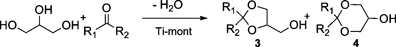 | a Reaction conditions: glycerol (1 mmol), carbonyl compounds (2 mmol), Ti-mont (0.1 g), MS4A (0.5 g), 1,4-dioxane (5 mL), room temp. b Determined by GC based on glycerol. |