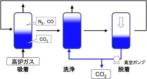 炭酸ガスのPSAの方式として,様々な方法があると考えられるが,我々が用いているのは,図1に示した3塔3ステップ方式というシンプルな方式である。最初の吸着工程では,吸着剤を充填した吸着塔に原料ガスを供給し,所定の圧力で一定時間流通させる。この段階で塔内の炭酸ガス濃度は70%程度まで濃縮される。この濃度では不十分なので,次の洗浄工程では,高濃度の炭酸ガスを供給する。これにより塔内の不要なガス(原料ガスが高炉ガスの場合は,窒素およびCO)をパージして,所望の炭酸ガス純度にまで精製する。最後の脱着工程では,塔内を真空ポンプで減圧し,高純度化された炭酸ガスを回収すると共に,一部を洗浄工程に供給する。この3つの工程を,3つの塔で順繰りに行うこととなる。