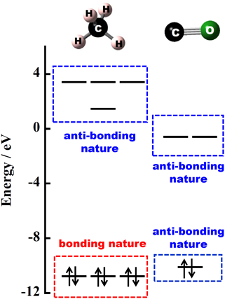 ② メタンとCOとの分子軌道図(図9)に着目すると,HOMOとLUMOのエネルギー準位の関係が良く類似していることがわかる。