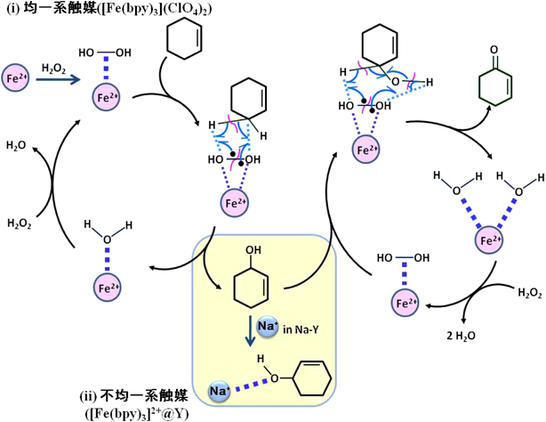 本触媒の反応機構についても検討されている31–34)。反応系中にラジカルトラップ剤(2,6-ジ-tert-ブチル4-メチルフェノール)を添加したところ,酸化生成物が観測されなかった。従って,[Fe(bpy)3]2+@Y触媒は過酸化水素と反応し,フェントン反応を経て,ラジカル活性種を形成して反応が進行していると考えられる。また,[Fe(bpy)3](ClO4)2を用いた2-シクロヘキセン-1-オールの酸化反応では,2-シクロヘキセン-1-オンが生成したことから,[Fe(bpy)3](ClO4)2触媒でのシクロヘキセンの酸化はオンからオールへ逐次的に反応が進行する(図5(ⅰ))。[Fe(bpy)3]2+@Yで高いアルコール選択性を示す理由として,Y型ゼオライト内に存在しているNa+イオンが2-シクロヘキセン-1-オールを捕捉するため,ケトンを生成する再酸化反応を抑制していることが考えられる(図5(ⅱ))。アルコールを捕捉できない(CH3)4N+イオンにNa+イオンの一部を交換した触媒を用いるとアルコール選択性が低下したことからも支持される。以上の結果から,[Fe(bpy)3]2+部位は触媒活性部位として酸化反応に寄与し,Na+イオン周りは親水性部位あるいは生成物捕捉部位として,アルコール選択性発現に寄与していると推測できる。また,[Fe(bpy)3]2+@Yでは,触媒内に親水性・疎水性の両方の部位ができ,その結果,水中でもシクロヘキセンの選択的水酸化反応を優先的に進行すると推察している。