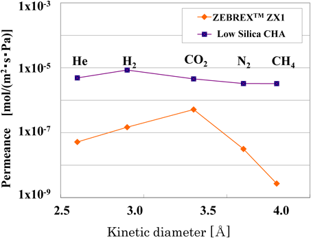 このように,8員環ゼオライトは二酸化炭素/メタンの分離において有望であると考えられるが,これまで記載してきたように,ZEBREXTM ZX1は高シリカアルミナ比を持つ緻密なCHA型ゼオライト膜であるため,ガス分離においてもCHA型特有の構造に起因したガス分離性能が得られることが期待される。図3からわかるように,細孔径の大きさは二酸化炭素や水素よりも大きく,メタンなどの炭化水素よりは小さいので,天然ガスからの二酸化炭素の分離や水素中の不純物炭化水素の除去などへの適用が期待される。