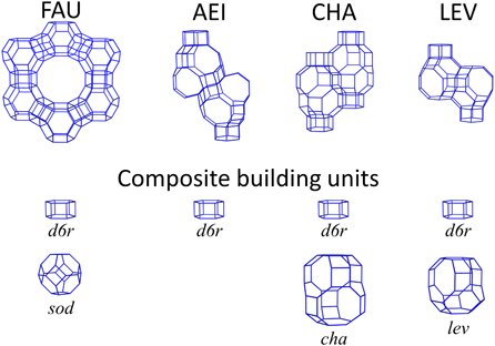Fig. 2. Framework structures and composite building units of FAU zeolite and small-pore zeolites (AEI, CHA and LEV).