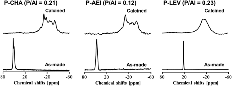 上述のように,リン含有OSDAを活用することで,小細孔ゼオライト内部へリン種を導入できた。しかし,その導入量の制御には,多段階的な後処理と過酷な熱処理条件が必要であり,得られたゼオライトの結晶性/細孔特性の低下やリン導入度の制御の難しさが懸念された。そこで,導入されるリン量を簡易に制御し,かつ細孔特性を改善するために,ホスホニウムカチオンとアンモニウムカチオンを用いた2成分混合系によるリン修飾小細孔ゼオライトの合成を試みた9,10,12)。本合成系では,合成中に取り込まれたアンモニウムカチオンは焼成によって細孔から除去されるが,ホスホニウムカチオンは酸化/分解によってリン修飾源となるとともに,ゼオライト細孔内のアンモニウムカチオンとホスホニウムカチオンの割合を変化させることでリン修飾度の制御が可能である。これまでにホスホニウムカチオン単成分で合成可能なゼオライトであるLEV, CHAおよびAEIゼオライトの合成に関して,それぞれ適したアンモニウムカチオンを併用することで,そのリン修飾度を制御した合成に成功した。いずれの骨格構造を持ったゼオライトにおいても,リン修飾の有無でXRDパターンや粒子形態に変化は観察されなかった(Fig. 4)。水熱合成後のこれらゼオライトの31P MAS NMRスペクトルには(Fig. 5),アルキルホスホニウムカチオンに由来するピークが1本のみ観察された。焼成を経由することで−10~−40 ppmにゼオライト骨格中のAlと結合したリン酸化物種に帰属されるピークが観察され,細孔内に取り込まれたアルキルホスホニウムカチオンが酸化/分解し,ゼオライト骨格へ修飾されたことが確認された。SEM/EDX元素マッピングから,骨格由来の元素であるSi,AlとPの分布はよく一致し,細孔特性からもリン修飾によって過度に細孔閉塞が起こっていないことから,リン酸化物種はゼオライト結晶内に均一に分散していると考えられる9,10)。さらに,すべてのサンプルの27Al MAS NMRスペクトルには四配位Alに帰属されるピークが明瞭に観察された。また,29Si(CP)MAS NMRおよびOH伸縮振動領域のFT-IRスペクトルには,リン修飾によるゼオライト骨格欠損の明確な生成は観察されなかった9,10)。以上の結果から,アンモニウムカチオンとホスホニウムカチオンを併用したゼオライト水熱転換によって,高い結晶性を維持しつつリン修飾度の制御された小細孔ゼオライトが合成可能であることが明らかとなった。