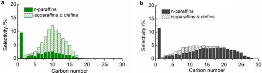 FT合成用触媒では,生成物はおおむね重合確率則に従うため,高い選択率で目的の留分を得ることができない。具体的に,ガソリン燃料(C5–11),ジェット燃料(C8–16),軽油燃料(C10–20)では選択率がそれぞれ48,41,40% という値を超えられないと予測されていた。様々な研究機関がFT合成によるこれらの生成物の選択率向上のために研究を行った結果,ガソリン,軽油燃料については増加傾向が見られたが,ジェット燃料については依然として選択率を向上させることは困難を極めていた。