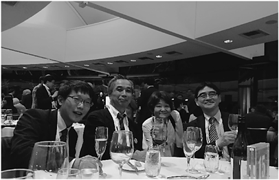 会期4日目の夜にはConference Dinner(IZC’19 Gala Dinner)が開かれ,多くの先生方が出席されました。学生の参加者は少ない中,この機会にさらに世界的に著名な先生方と交流を深めたいと思い,学生の身ながら参加させていただきました。Conference Dinner中にはInternational Zeolite Association(IZA)が設置している数々の賞の授与式も執り行われました。The 2019 IZA AwardにはWilhelm Schwieger先生,The 2019 Don Breck AwardにはMark E. Davis先生,The first Young Researcher AwardにはManuel Moliner先生が受賞されました。そしてIZA Honorary Membershipsには,日本から辰巳敬先生を始め3人の先生方が選出されました。Conference Dinnerではこれらの世界的に著名な先生方と交流でき,励ましのお言葉もいただくことができました(写真)。