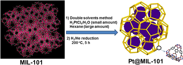 Traditional methods for the synthesis of metal NPs in MOFs would inevitably afford metal NPs deposited on the external surface of MOFs, which would easily aggregate during the reaction condition, resulting in catalyst deactivation. To address this challenge, we have developed a “double solvents” method to immobilize ultrafine Pt NPs inside the pores of MIL-101 without aggregation of Pt NPs on the external surface of framework46). This method is based on the dissolution of metal precursors (H2PtCl6) in a hydrophilic solvent (water) with a volume set equal to or less than the pore volume of the adsorbent (MIL-101) and a hydrophobic solvent (hexane) in a large amount to suspend the adsorbent and facilitate the impregnation process (Fig. 4). Further treatment in a stream of H2/He (50 mL min−1/50 mL min−1) at 200°C for 5 h yielded Pt@MIL-101. Electron tomographic reconstruction showed that Pt NPs with an average size of 1.8±0.2 nm were uniformly distributed in MIL-101 framework. The as-synthesized Pt@MIL-101 exhibited excellent catalytic activities for reactions in all three phases (i.e., liquid-phase AB hydrolysis, solid-phase AB pyrolysis, and gas-phase CO oxidation). In the hydrolysis of AB, 2 wt% Pt@MIL-101 completely converted AB to H2 within 2.5 min, with a TOF value of 1.0×104 LH2 molPt−1 min−1. In the pyrolysis of AB, AB dehydrogenation in the pores of Pt@MIL-101 showed lower dehydrogenation temperature and higher H2 selectivity compared with pure AB and pristine MIL-101. In CO oxidation, Pt@MIL-101 also showed high activity, achieving complete conversion of CO at 150°C. This work represents the first example of highly active MOF-immobilized metal nanocatalysts for catalytic reactions in all three phases. The “double solvents” method has been successfully extended to the synthesis of Pd NPs within MOFs. The obtained Pd@MOF composites showed high activity and stability in reduction of 4-nitrophenol (4-NPh) by sodium borohydride (NaBH4)47), hydrodeoxygenation of vanillin48), reduction of Cr (VI) using formic acid49).