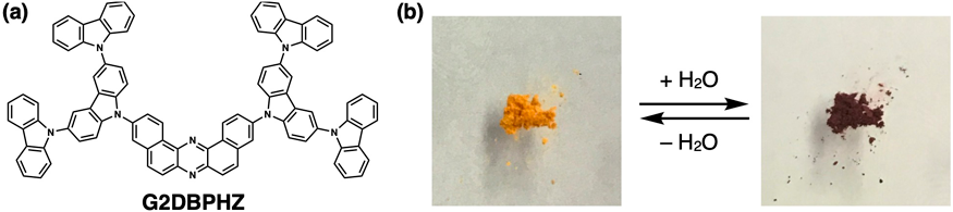 このような背景の中,筆者らは偶然からクロミック特性を示す多孔質結晶を新たに見出している10)。電子機能性デンドリマーの集合化挙動を探索していたところ,コアにジベンゾフェナジン,側鎖として第2世代カルバゾールデンドロンを有する新規なデンドリマー分子3,11-bis(9′H-[9,3′:6′,9″-tercarbazol]-9′-yl)dibenzo[a,j]phenazine(G2DBPHZ)が,多孔質分子結晶(van der Waals porous molecular crystal, VPC-1)を構築した(図4a)。結晶は繊維質で単結晶構造が得られなかったものの,粉末X線回折および窒素吸着等温線の結果から多孔質分子結晶であることが明らかとなった。