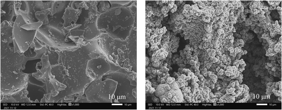 漂着軽石を水熱処理して得た試料のX線回折パターンを図3に示す。シラス軽石と比較すると,ゼオライトの結晶化に高温処理が必要となる傾向が見られた。シラス軽石も漂着軽石も天然物ゆえに不明な部分が多く反応系が複雑であるため,最適な合成条件や生成したゼオライト相の違いに関しては今も調査・考察中である。水熱処理後の試料の外観を図4に示すように,軽石の形態を保っており,本研究のオリジナリティであるゼオライト軽石を無事に得ることができた。また,図5に示す電子顕微鏡像から,シラス軽石を原料に用いた場合と同様に,軽石表面を覆う緻密なゼオライト生成や,軽石とゼオライトの一体構造の形成を確認することができた。自信はありつつも,正直,ホッとした瞬間だった。漂着軽石のゼオライト化成功については,NHKニュース7でも放送していただいた。思わぬきっかけで,シラス軽石だけでなく漂着軽石を対象とした実験をすることになったが,そのおかげでゼオライト軽石の作製技術が複数種の軽石に適用可能なことを実証することができた。
