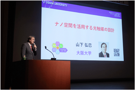 1日目の午後には「ナノ空間を活用する光触媒の設計」というタイトルで大阪大学の山下先生に特別講演をいただきました。ナノ粒子化による効果や反応場の疎水化,MOF,合金等触媒の活性向上へのアプローチについて様々に例を挙げてお話いただきました。ゼオライトの疎水化により活性が大きく向上した話や金属ナノ粒子の反応性の高さは,金属カチオンを担持したゼオライト材料に対する競争吸着を扱っている私にとっても大変参考になるお話でした。